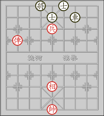 es gewinnt 1. Sd8!, denn 1.- Lxd8 scheitert an 2. Wb10+ Fd9 3. Wb9+ Fd10 4. Wxg9 und Rot hat einen Wagen mehr. In Peters game014.gif wird diese Variante noch exemplarisch zum Ende geführt, z.B. 4.- Fe10 5. Wg6 Lfe9 6. Ec1 Ff10 7. Wi6 Ff9 8. Wf6+ Lf8 9. Ff1 Le9 10. Wh6 Ld8 11. Wh8 Le9 12. Wh9+ Ff10 13. Wxe9 patt.